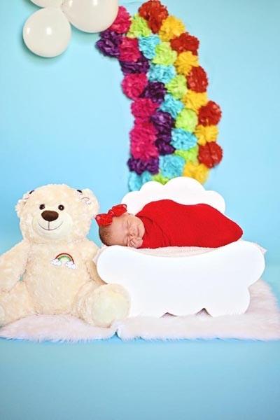 This photo is of our rainbow baby and our Kowen Bear. Our son was stillborn at 30 weeks for no known reason. I can't begin to explain the pain of his loss. We were blessed to bring home our rainbow baby girl just 10 months and 22 days after our son was born. Having them so close together has had its ups and downs, our Kowen Bear has become Avelyn's very special friend who she gently hugs and kisses as if she knows how special he really is. He filled my arms when they were empty, I had lost our son and was desperately hoping for our rainbow to make it here safely. I know this bear will help Avelyn feel as connected to Kowen as she grows we do.